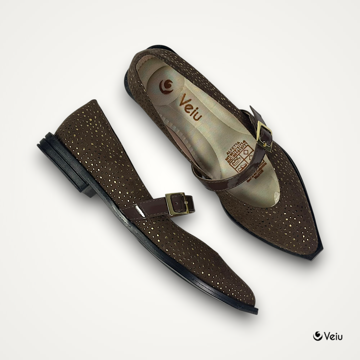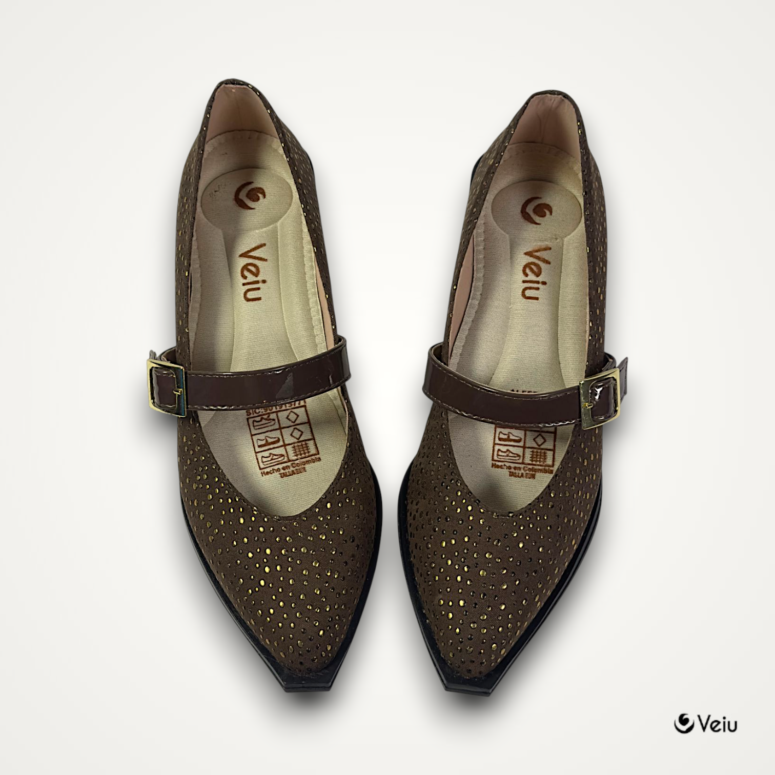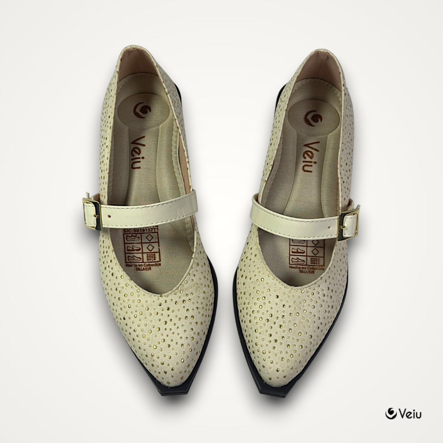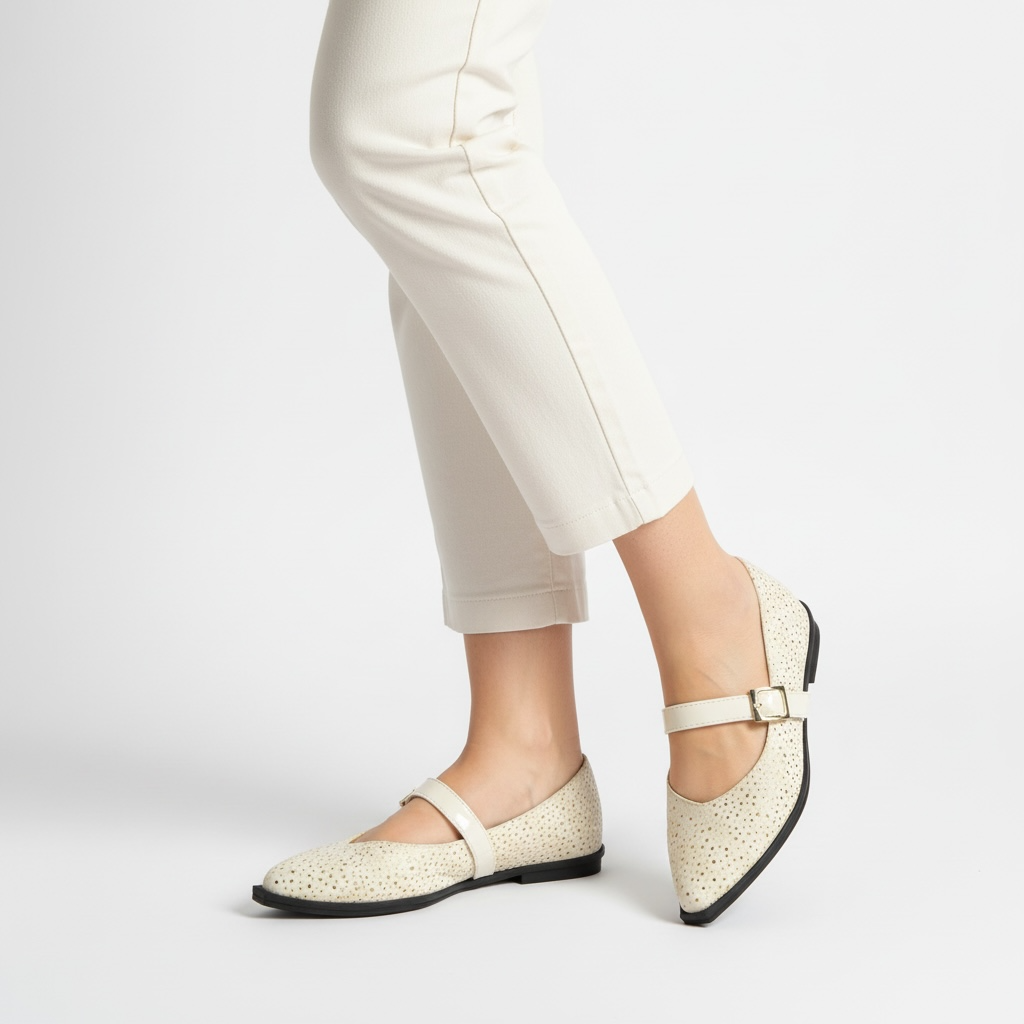 Un diseño femenino y elegante que combina estilo y comodidad. Estas ballerinas destacan por su punta estilizada, correa con hebilla para mejor ajuste y delicadas decoraciones de pepitas que le dan un toque sofisticado.