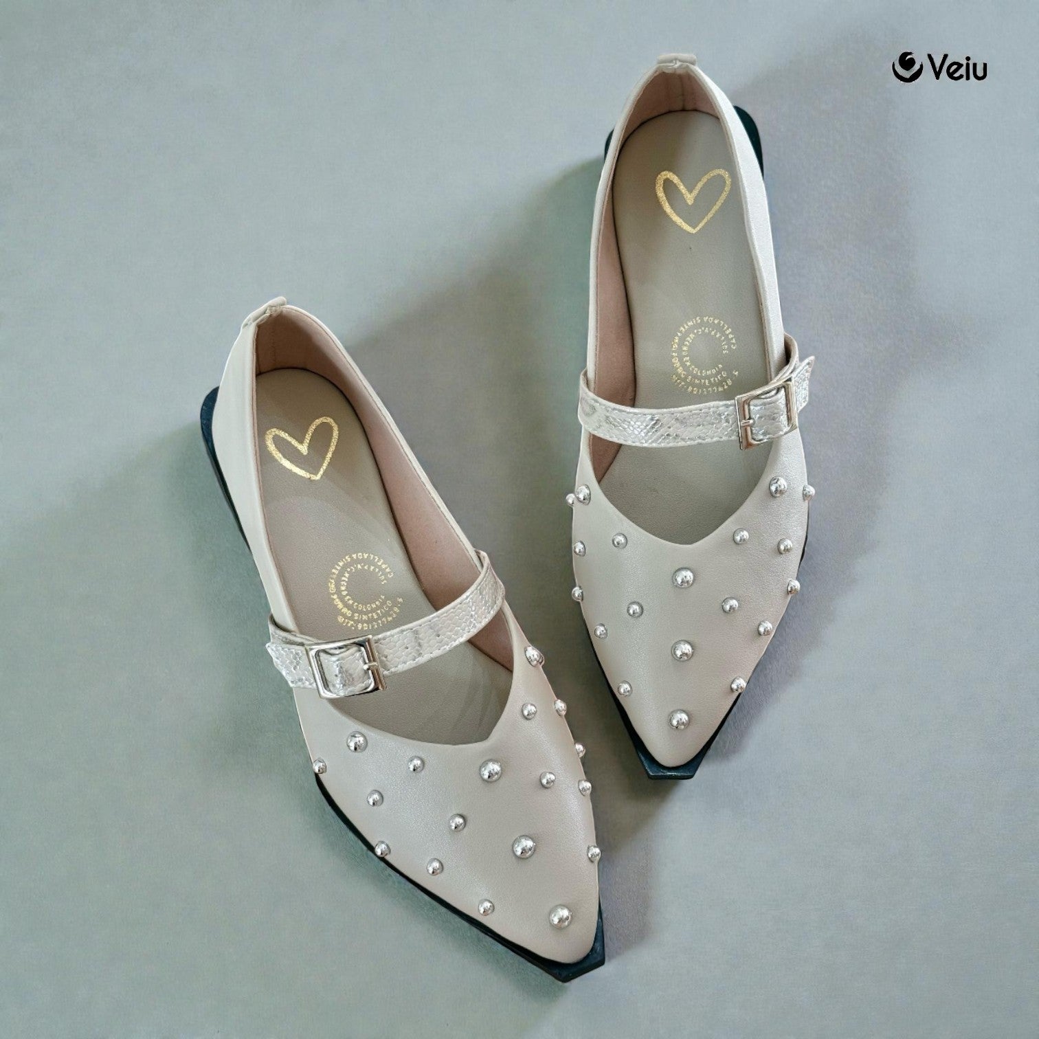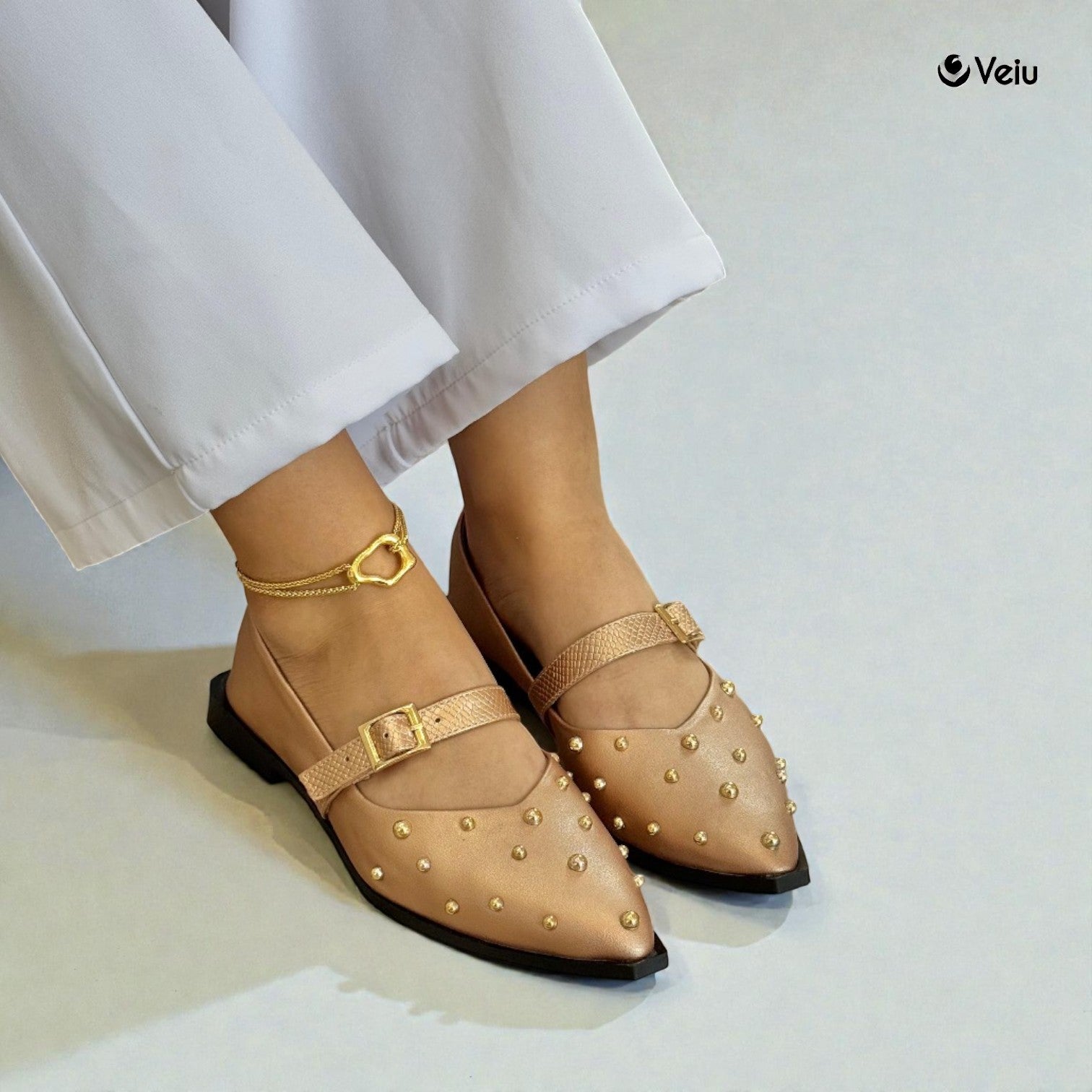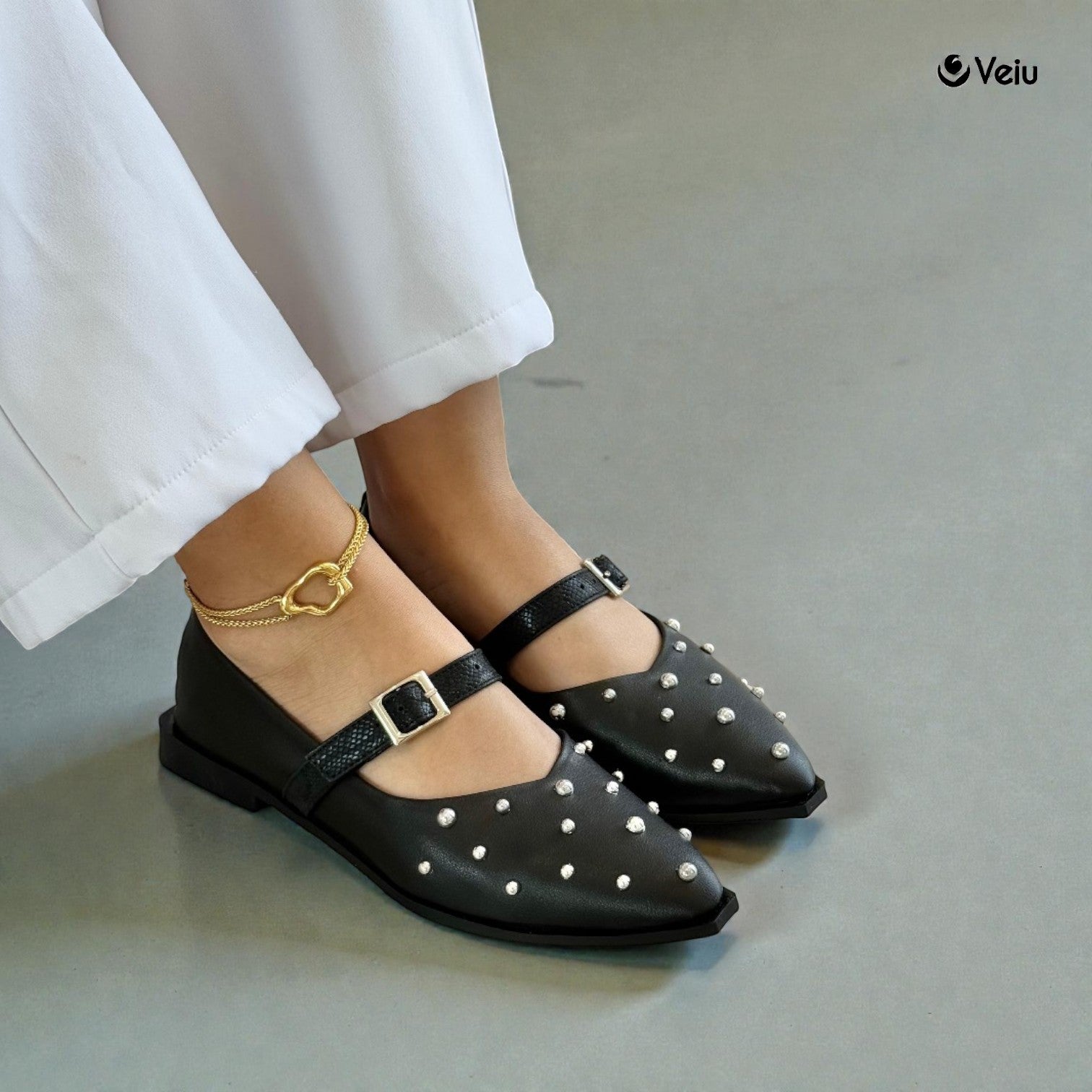 Nuestra baleta plana con taches es la mezcla perfecta entre lo clásico y lo actual. Mantiene la silueta tradicional que tanto se usa para oficina y looks diarios, pero incorpora un detalle moderno que la hace única: taches sutiles y elegantes que elevan cualquier outfit sin perder comodidad.