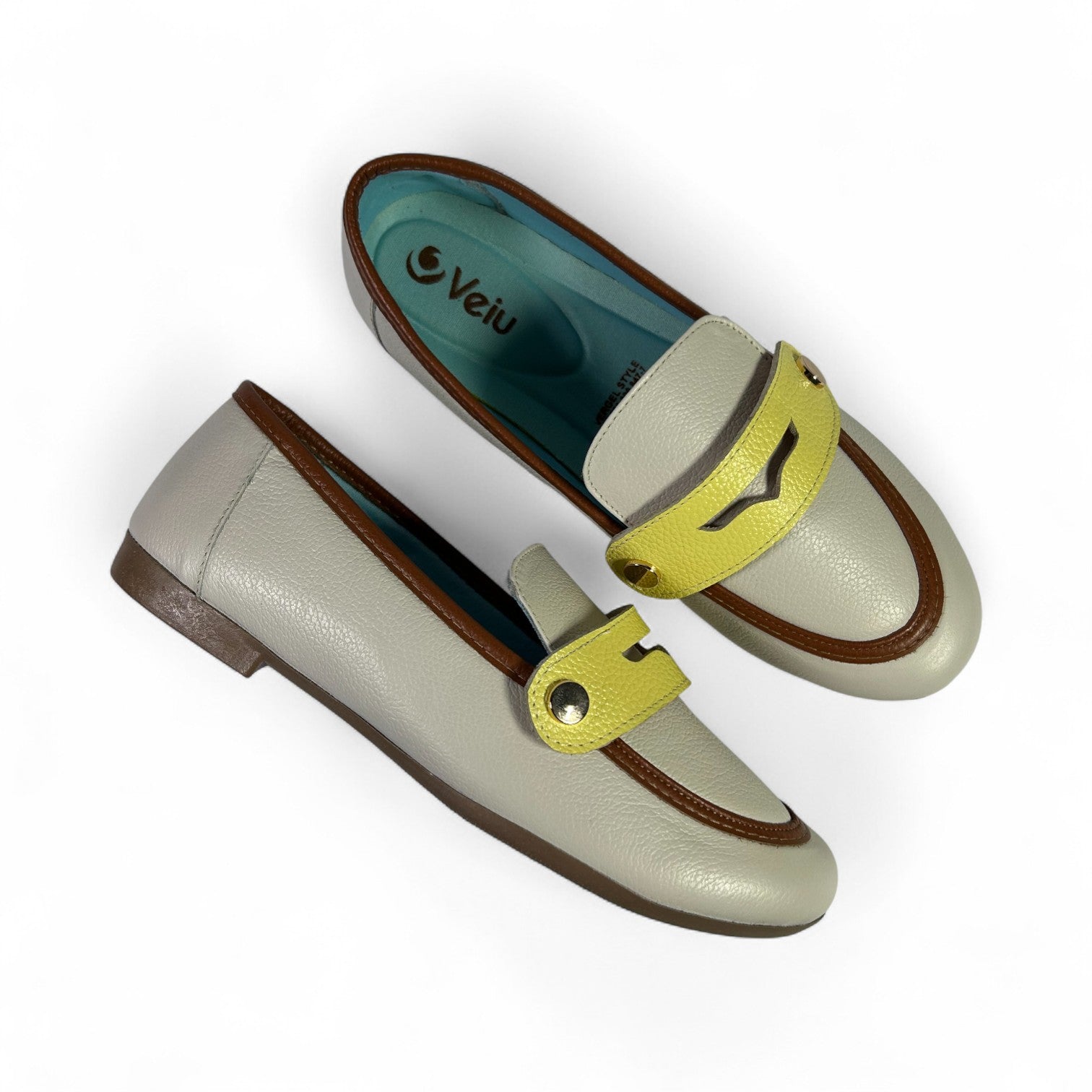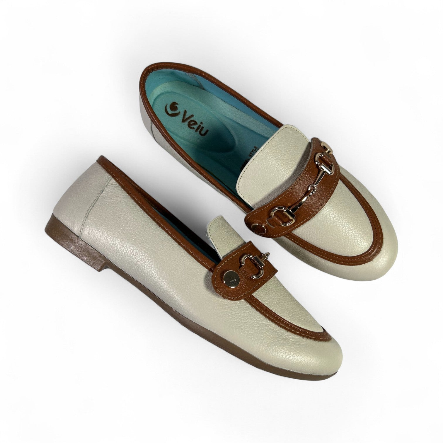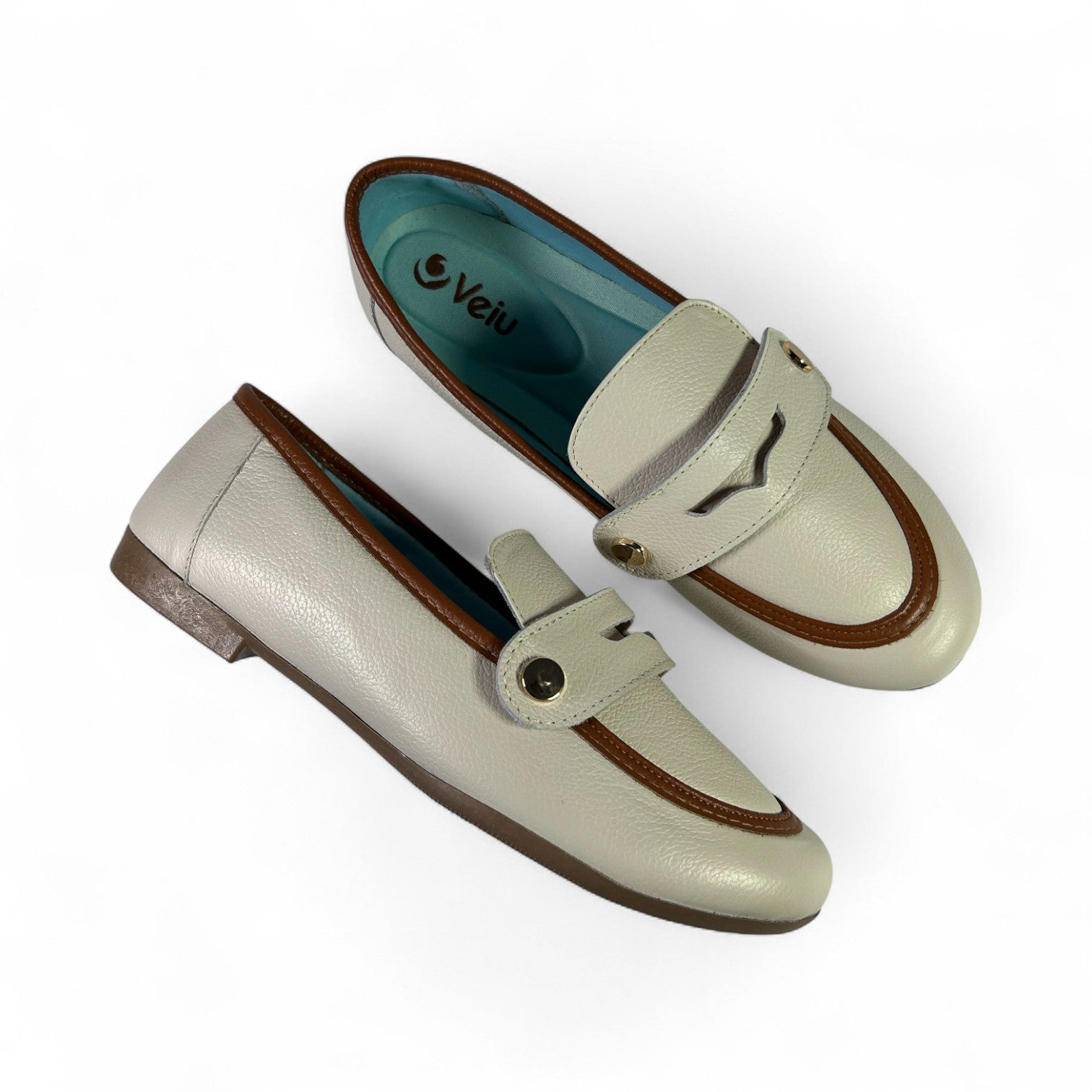 Este modelo en tono talco con detalles en miel combina elegancia, suavidad y un contraste refinado que eleva cualquier look. Su fabricación en cuero natural y acabados premium garantizan confort y durabilidad.